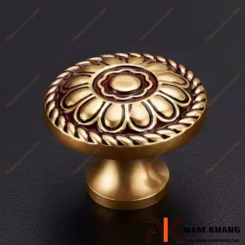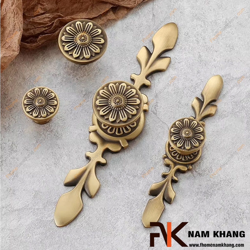 Tay nắm dạng núm cổ điển là lựa chọn linh hoạt và phổ biến nhất, đặc biệt phù hợp với các ngăn kéo nhỏ, tủ đầu giường, hoặc bàn trang điểm. Điểm đặc trưng của loại tay nắm này chính là thiết kế nhỏ gọn nhưng vẫn đầy tinh tế. Mỗi chiếc núm được chạm khắc những hoa văn cầu kỳ, từ họa tiết hoa lá mềm mại, uốn lượn đến các hoa văn đối xứng.