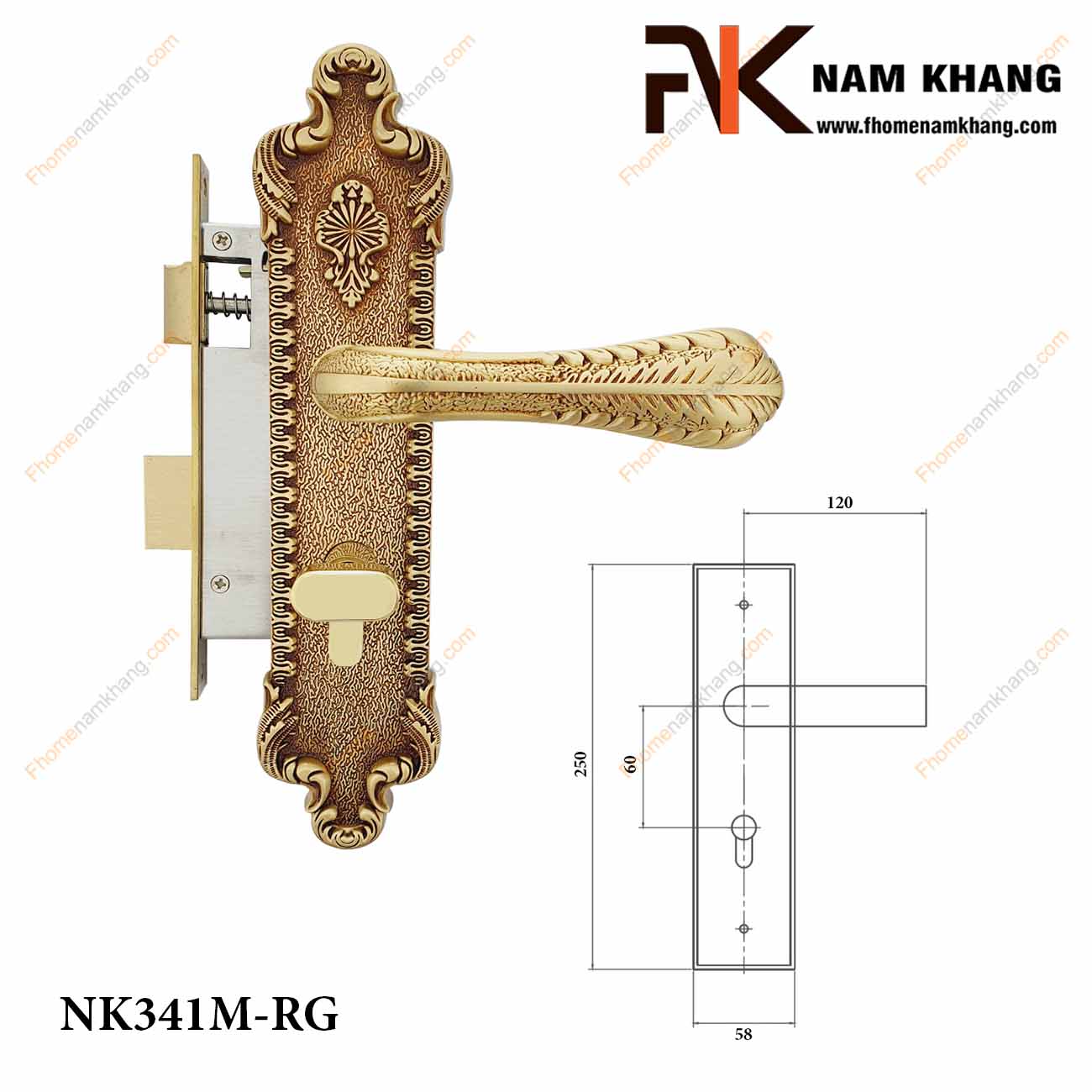 Khóa cửa thông phòng NK341M-RG được sản xuất từ chất liệu đồng cao cấp, toàn bộ phần thân được phối họa tiết hoa cổ điển và sử dụng công nghệ mạ màu phối điểm đỏ nổi bật.