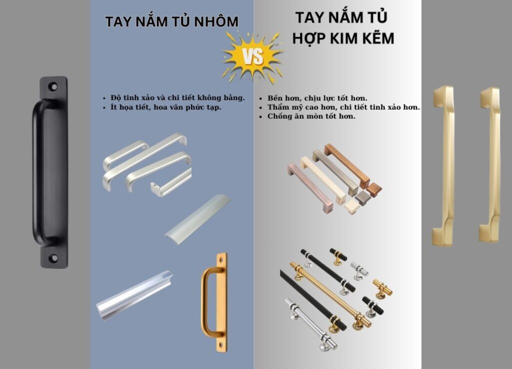 Tính thẩm mỹ: Hợp kim kẽm có thể được chế tác với nhiều chi tiết tinh xảo hơn nhôm, tạo ra những mẫu mã đa dạng và sang trọng hơn. Bề mặt tay nắm cũng có độ bóng và độ mịn cao hơn, mang lại vẻ đẹp cao cấp.