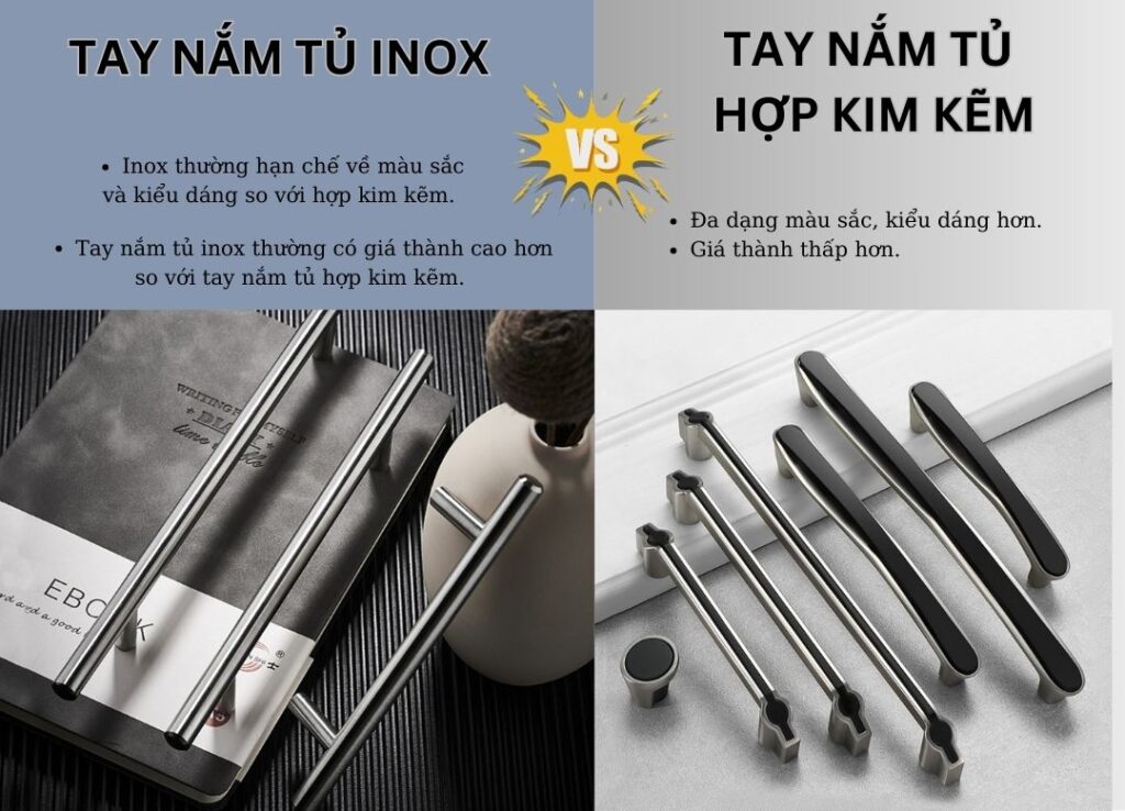Tính thẩm mỹ: Hợp kim kẽm có thể được mạ hoặc sơn phủ với nhiều màu sắc và kiểu dáng khác nhau, trong khi inox thường chỉ có màu bạc sáng. Điều này giúp tay nắm này phù hợp với nhiều phong cách nội thất hơn.